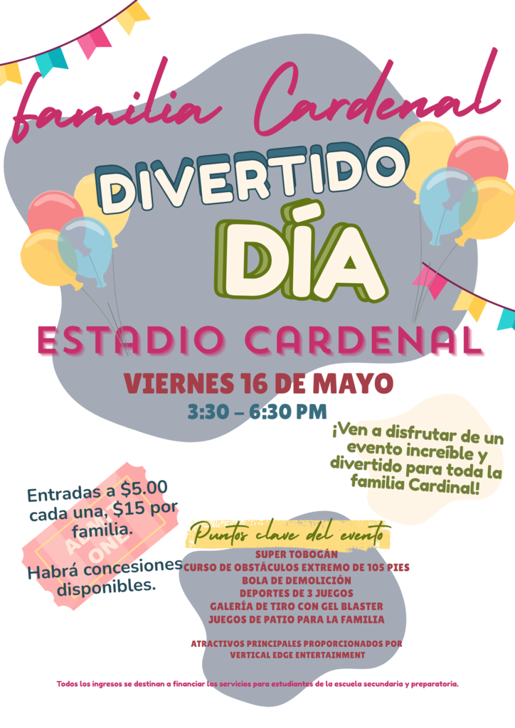 Este viernes, acompáñenos para el Día de Diversión Familiar Cardinal en el Estadio Cardinal de 3:30 a 6:30 p.m.